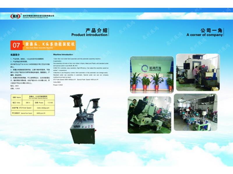 ??泉州市展鴻自動(dòng)化科技有限公司始創(chuàng)于2003年,是一個(gè)集研發(fā)、制造、銷售為一體的現(xiàn)代化公司,專業(yè)從事研發(fā)、生產(chǎn)各類型號(hào)的全自動(dòng)拉鏈頭裝配機(jī)。泉州市展鴻自動(dòng)化科技有限公司始創(chuàng)于2003年,是一家集研發(fā)、生產(chǎn)、銷售、服務(wù)于一體的現(xiàn)代化拉鏈頭設(shè)備智能制造生產(chǎn)企業(yè):專業(yè)從事研發(fā)、生產(chǎn)各類型號(hào)的全自動(dòng)拉鏈頭智能裝配機(jī)。亦可根據(jù)不同客戶的需求,提供適合客戶自身需要的“私人定制”式專用拉鏈頭設(shè)備及自動(dòng)檢測拉頭品質(zhì)一體機(jī)。泉州市展鴻自動(dòng)化科技有限公司始創(chuàng)于2003年,是一家集研發(fā)、生產(chǎn)、銷售、服務(wù)于一體的現(xiàn)代化拉鏈頭設(shè)備智能制造生產(chǎn)企業(yè):專業(yè)從事研發(fā)、生產(chǎn)各類型號(hào)的全自動(dòng)拉鏈頭智能裝配機(jī)。亦可根據(jù)不同客戶的需求,提供適合客戶自身需要的“私人定制”式專用拉鏈頭設(shè)備及自動(dòng)檢測拉頭品質(zhì)一體機(jī)。